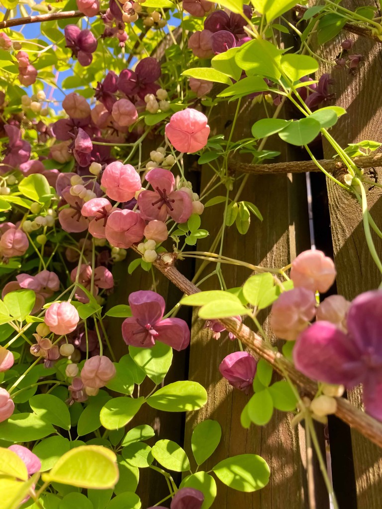 Fembladakebia – Akebia quinata, har vakre, finurlige blader og like fine blomster som er kun synlig fra nært hold. Planten trives i sol og kan håndtere noe skygge.